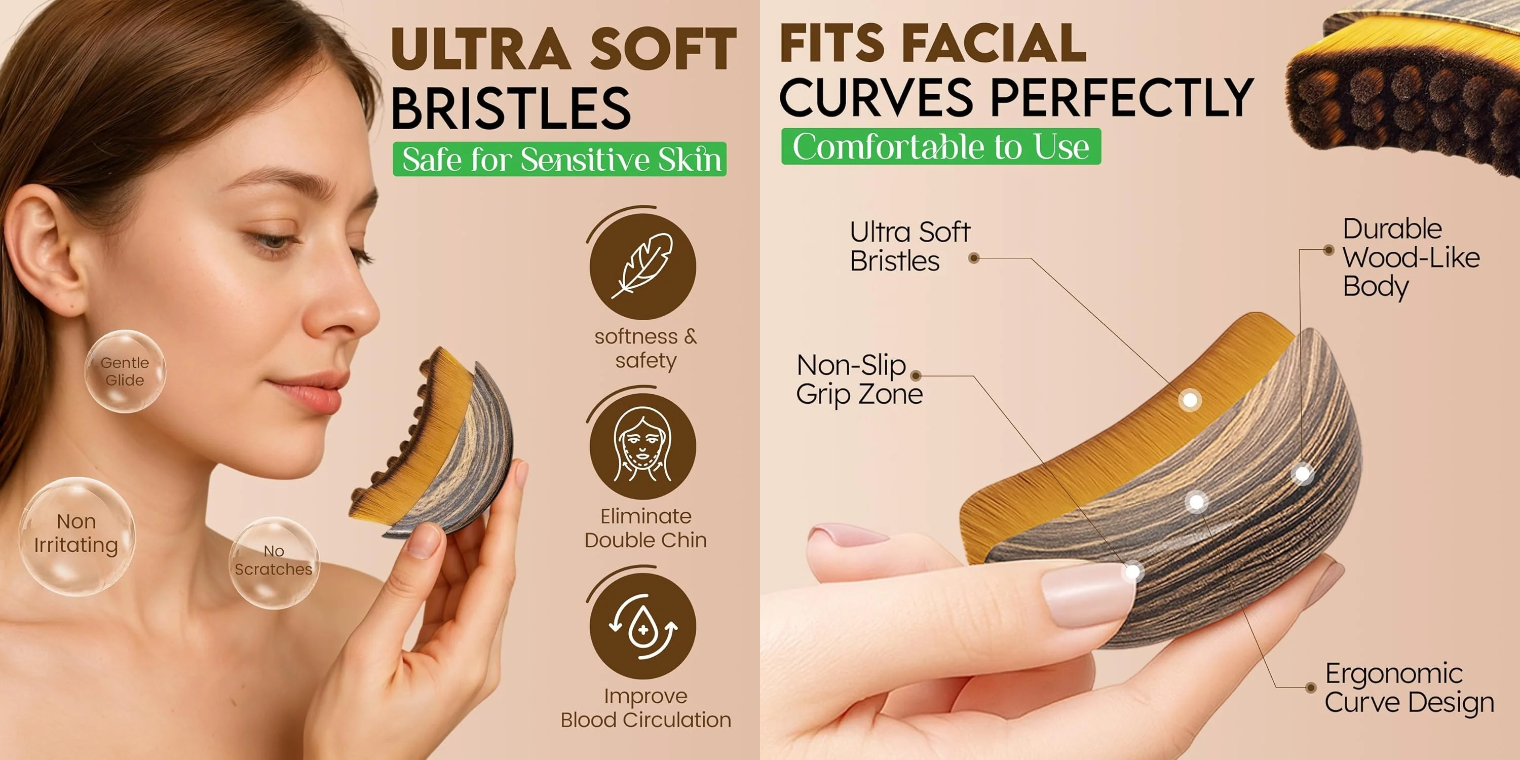A soft bristle face brush that drains puffiness, lifts hooded eyes, and sculpts your jawline in minutes. Works completely dry without oils or mess. Gentle enough for sensitive skin, effective enough for visible results every single morning.